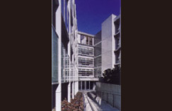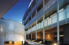 半透明のガラススクリーンをもつ居室のバルコニーが面した東側外観
